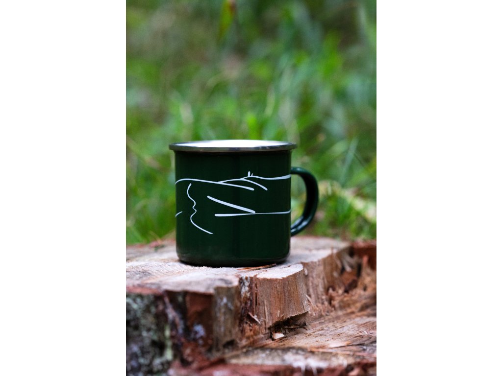 Smaltovaný tmavozelený hrnček s objemom 300ml s nerezovým okrajom s originálnym veľkofatranským motívom.